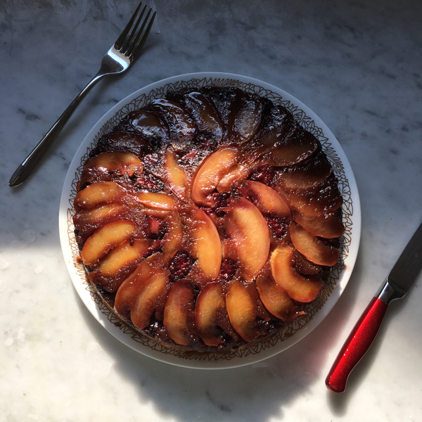 Every year for the summer solstice, I bake a "sun cake." Basically, It's just an upside down cake using seasonal stone fruit (my favorite). In the past, I've used peaches... but this year, I thought, "Hey, why not change it up a bit?" So here we arrive at an upside down cake with nectarines and blackberries. It still looks like a sun, but maybe it's more of a sun setting on the horizon, with those blackberry-stained jewel tones. What a lovely way to end the longest day of the year, with a big slice of cake and a scoop of vanilla ice cream.